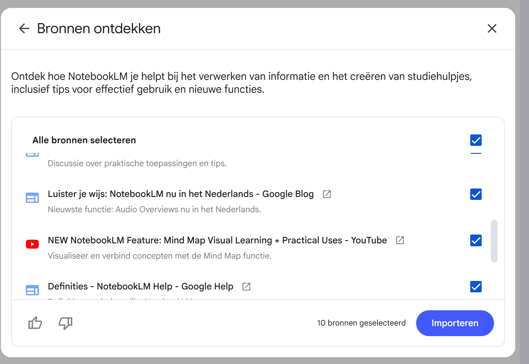 NotebookLM haalt dan zelf een lijst bronnen op en geeft die als voorstel aan je. Ze kan deze toevoegen, deselecteren of iets anders zelf verzinnen